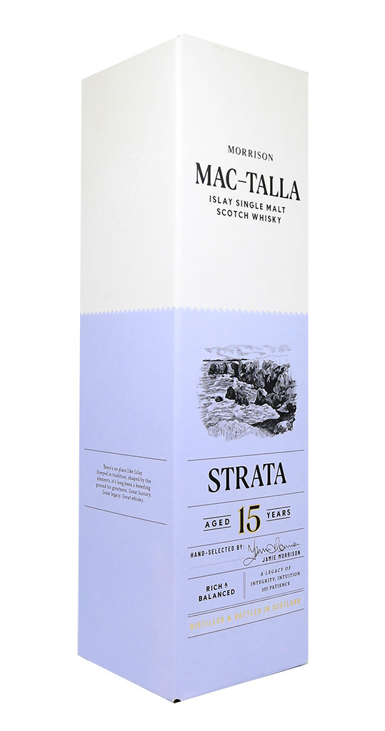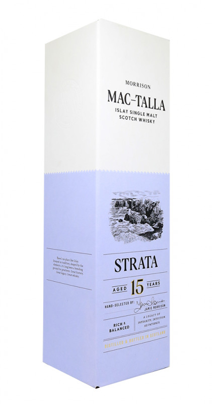 Strata, flertal af "lag", henviser til de mange geologiske lag og klippeformationer, der kendetegner Islays kyster og landskab, og symboliserer kompleksiteten og rigdommen i de fremstillede whiskyer. Denne enestående single malt er omhyggeligt lagret i 15 år på Bourbonfade og Sherryfade, hvilket sikrer en dyb modenhed og en perfekt balance mellem rundhed og aromatisk dybde.