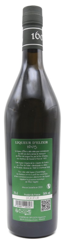 Créée en 2005 pour célébrer le 400ᵉ anniversaire de la remise du manuscrit originel aux Chartreux en 1605, la Liqueur d’Élixir 1605 rend hommage à l’« Élixir de longue vie » qui inspira la légende de la maison. Embouteillée à 56 % vol., elle met en avant une expression intense et puissante, révélant toute la profondeur végétale et la complexité herbacée qui font la singularité de la Chartreuse. La mise 2025 perpétue cette cuvée emblématique, recherchée autant par les collectionneurs que par les amateurs de liqueurs d’exception.
